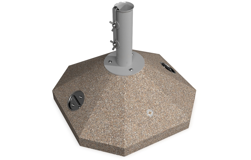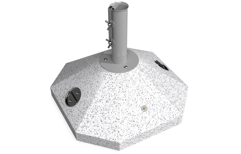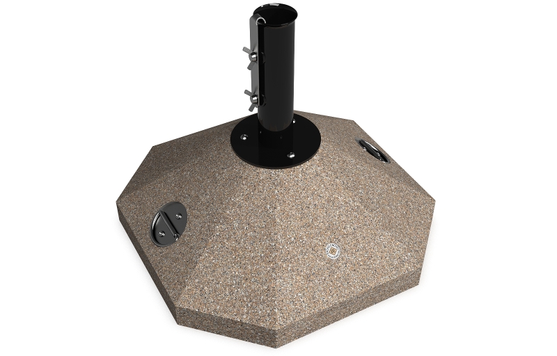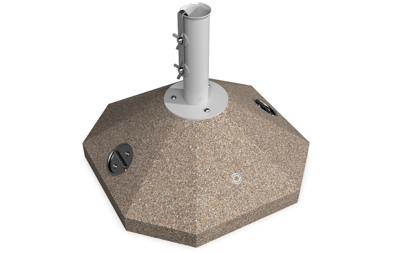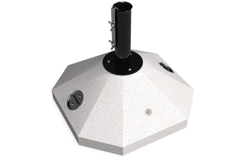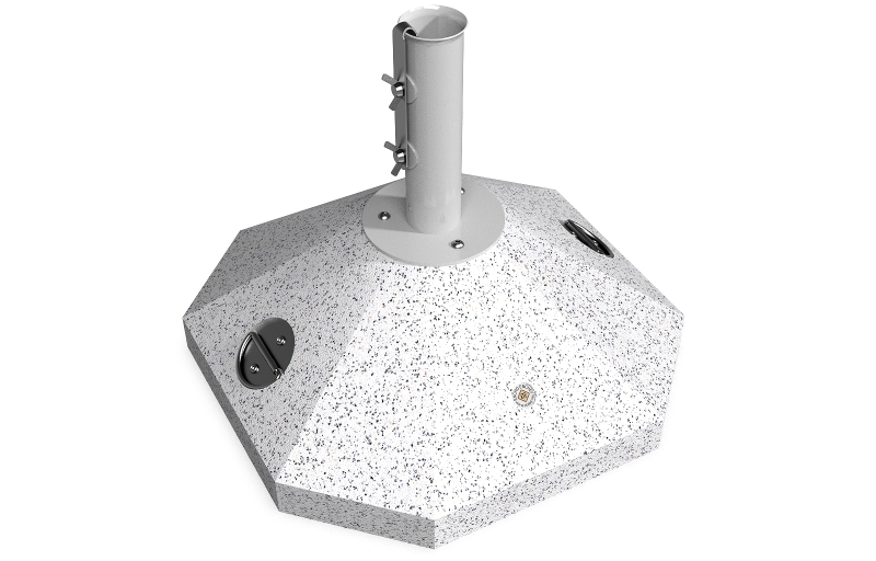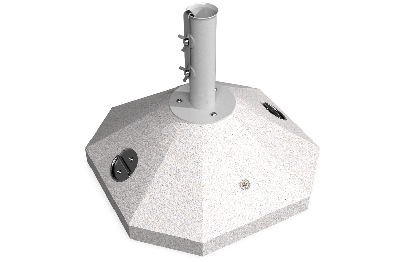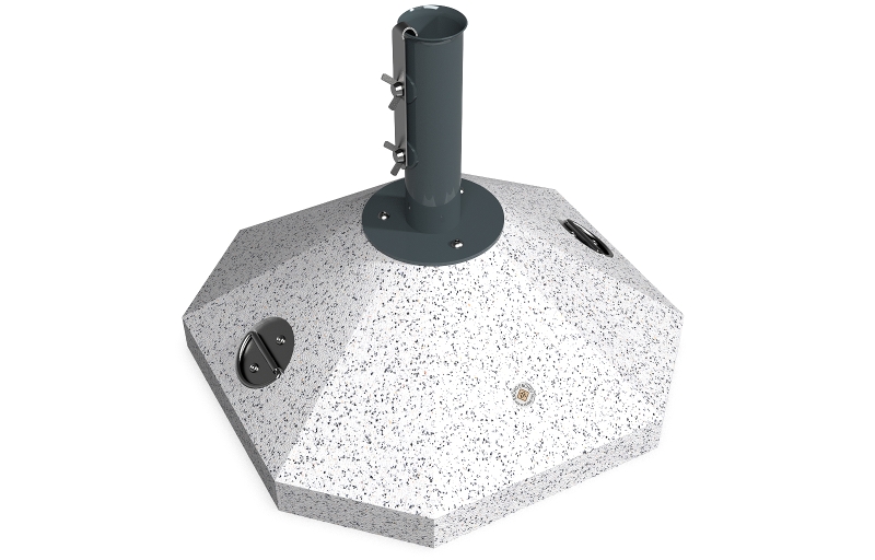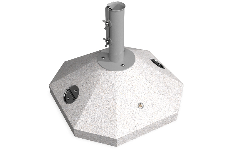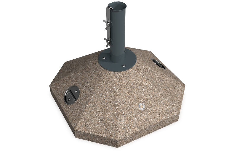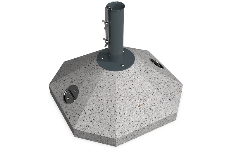 Eine Option die eine Lösung für kleinere Räume und Regenschirme bietet. Die Schirmbasis besteht aus hochfestem Beton und natürlichem mehrfarbigen Mosaik. Der Beton ist armiert und faserverstärkt. Die Mosaikstruktur besteht aus Naturmarmor – oder Granitsteinen. Der Beton ist geprägt und mit einer Metallstruktur kombiniert, die auch Farbvariation bietet. Das Metall wird mit Ester-Epoxy-Zink- Primer bedeckt und pulverbeschichtet. Diese Methoden schützen es vor Korrosion und verlängern die Haltbarkeit. Für Bereiche mit noch aggressiveren Wetterbedingungen wird eine zusätzliche Behandlung mit Zink angeboten. Alle Verbindungselemente bestehen aus Edelstahl. Die Metallkonstruktion kann auch in einer Edelstahlversion angeboten werden. Diese Eigenschaften gewährleisten Festigkeit, Haltbarkeit, Sicherheit und lange Lebensdauer des Schirmständers.