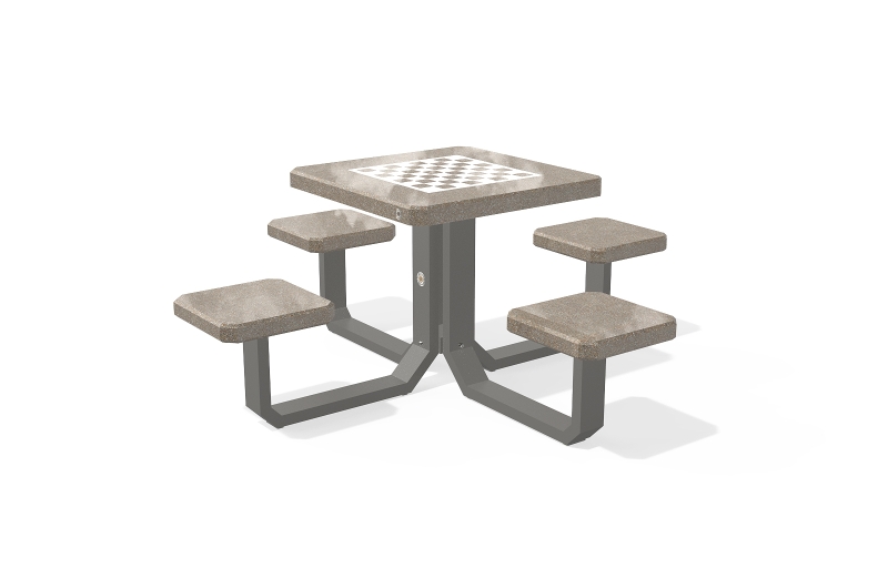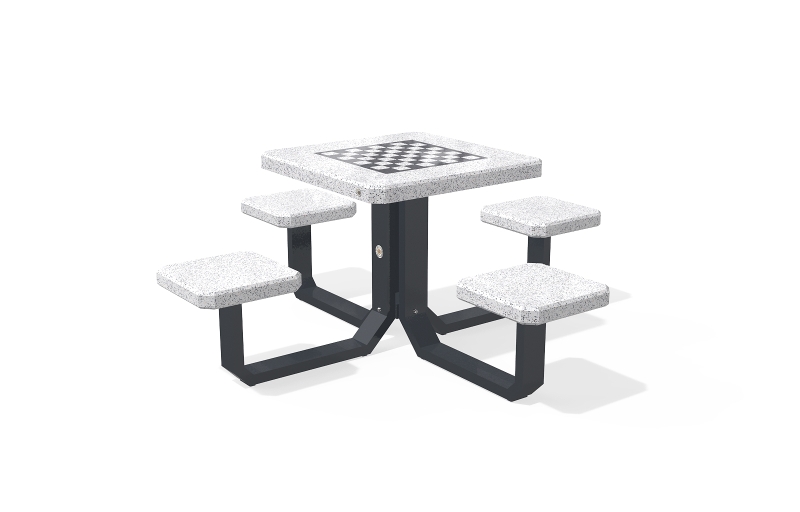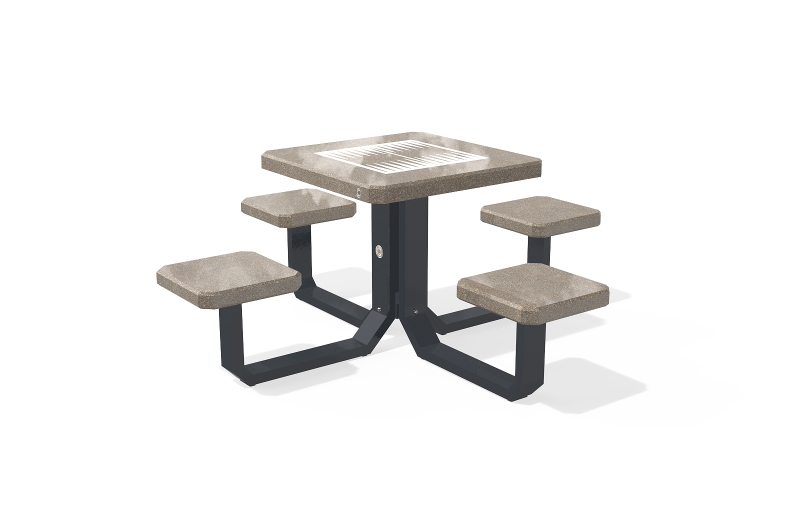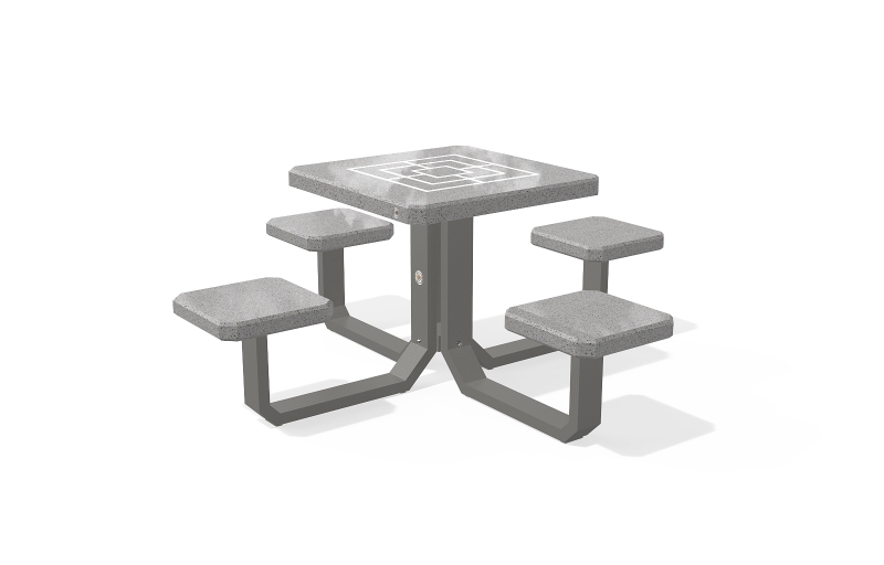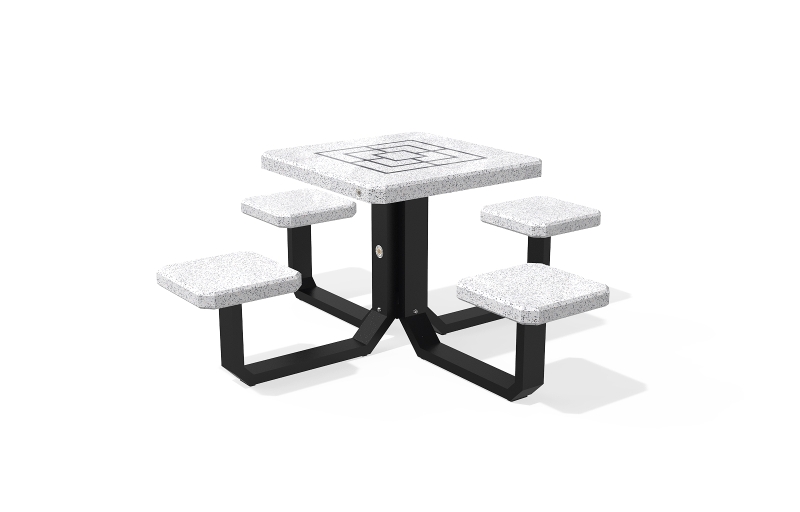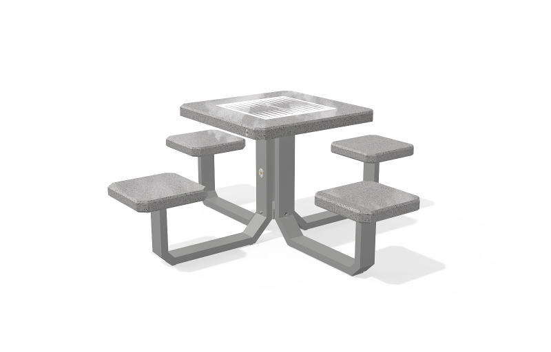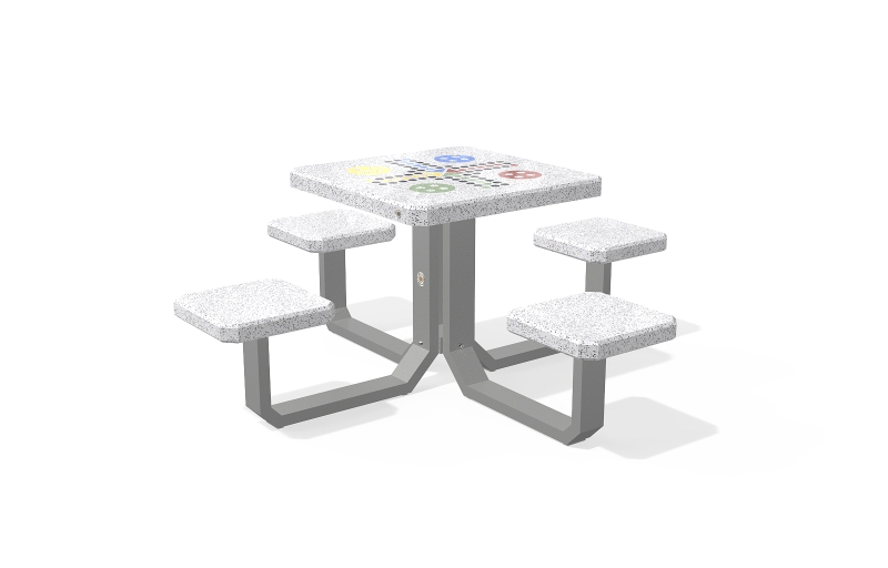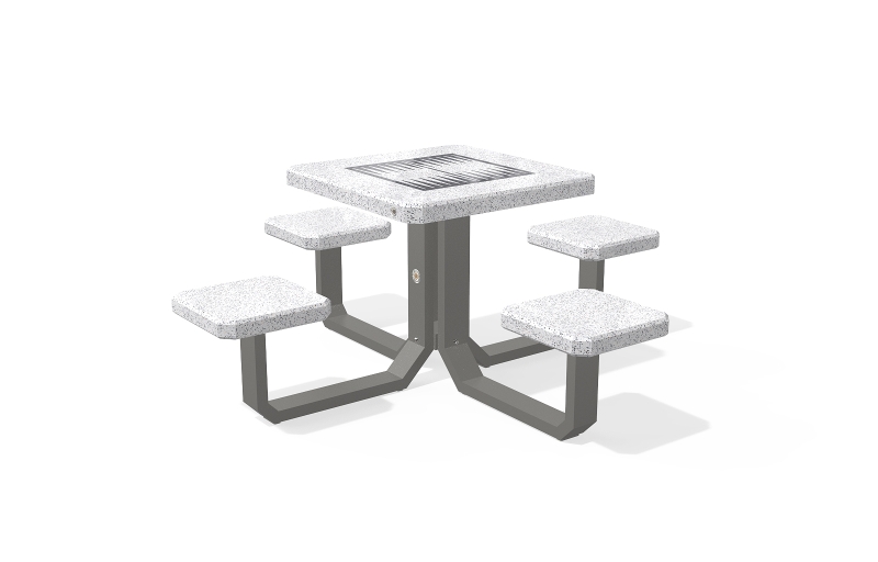 Der Spieltisch besteht aus hochfestem Beton und Naturmosaik, kombiniert mit Metallementen. Der Beton ist armiert und faserverstärkt. Die Mosaikstruktur besteht aus Naturmarmor- und Granitsteinen. Die Tischbeine bestehen aus Metall. Auf der Arbeitsplatte befinden sich Felder zum Spielen von Schach, Dame, Mühle, Backgammon und Mensch, ärgere dich nicht. Verschiedene Spielfeldkombinationen sind möglich. Sehr gut widerstandsfähig gegen aggressive Wetterbedingungen